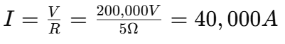 Q4. 송전선로에 설치된 피뢰기가 낙뢰에 의해 순간적으로 200kV의 전압을 접지로 방전하였다. 만약 접지 저항이 5Ω이라면, 이때 접지로 흐르는 순간 최대 전류는 몇 A인가?