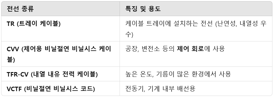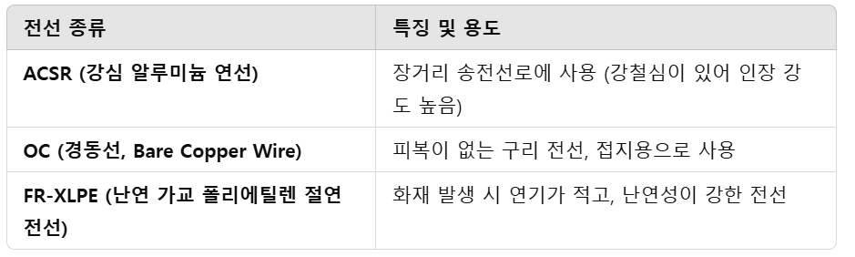 - 절연체(Insulation): 전선을 감싸 전기적 절연 역할 (PVC, XLPE 등)