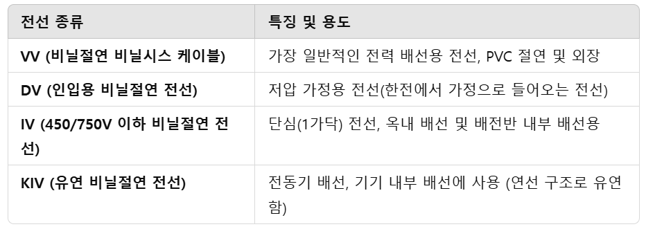 전선에는 규격을 표시하는 약어가 붙는데, 대표적인 것들을 정리하면 다음과 같습니다.