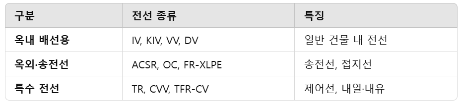 전선은 크게 옥내배선용, 옥외용, 송·배전용, 특수 전선 등으로 나뉩니다.
