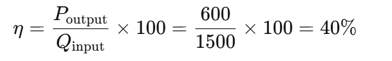 - 입력 연료 에너지가 1500MW이고, 발전소 출력이 600MW일 때 발전소 열효율을 구하시오.