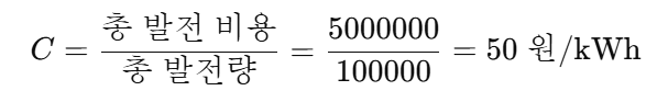 - 한 달 동안 총 발전량이 10만 kWh, 총 발전 비용이 500만 원이라면 단위 발전 비용을 구하시오.