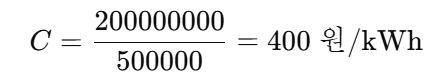 - 한 달 동안 총 발전량이 500,000kWh이고, 총 발전 비용이 2억 원일 때 단위 발전 비용을 구하시오.