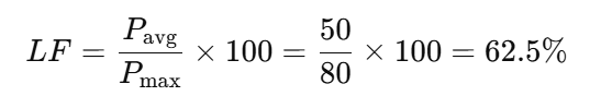 - 하루 동안 평균 부하가 50MW, 최대 부하가 80MW라면 부하율을 구하시오.