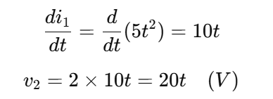 두 개의 코일이 서로 결합되어 있으며, 상호 인덕턴스 M=2H 입니다. 코일 1에 흐르는 전류가 다음과 같이 변화할 때, 코일 2에 유도되는 전압을 구하시오.