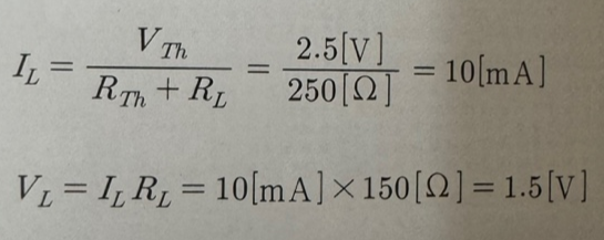 외부에서 볼 때, 회로는 이 등가 회로와 동일하게 동작합니다. 즉, 전압원과 직렬저항으로 바꿔주어도 회로의 전기적 특성은 동일하다고 볼 수 있습니다.