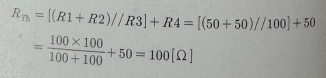 회로를 단자 쪽에서 바라보면, R1과 R2가 직렬로 연결되고, 이것들과 R3가 병렬로 연결됩니다. R4는 R1~R3과 직렬로 연결됩니다. 이를 회로로 나타내면 그림 (c)와 같습니다. 따라서 Rth를 구하면 다음과 같습니다.