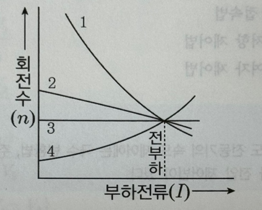 문제. 그림은 여러 직류 전동기의 속도 특성 곡선을 나타낸 것이다. 1부터 4까지 차례로 옳은 것은?