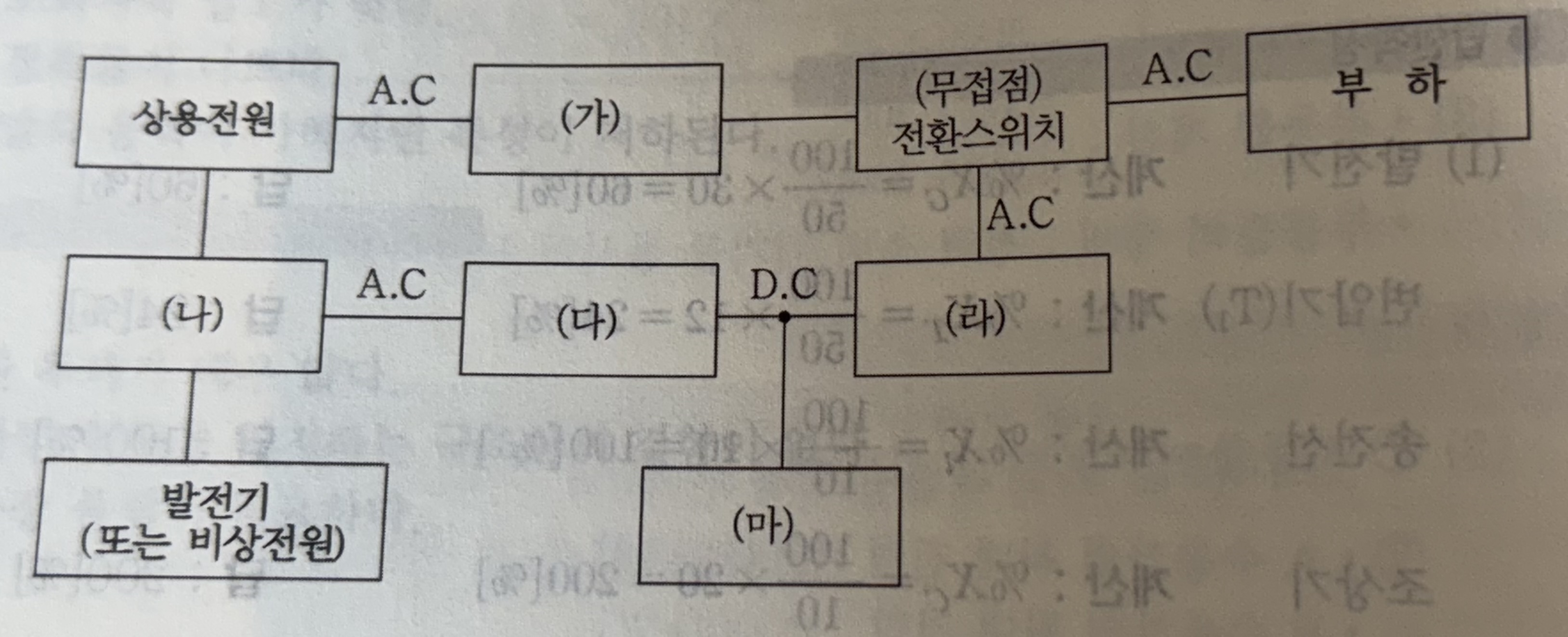 9. 다음은 컴퓨터 등의 중요한 부하에 대한 무정전 전원공급을 위한 그림이다. (가) ~ (마)에 적당한 전기 시설물의 명칭을 쓰시오.
