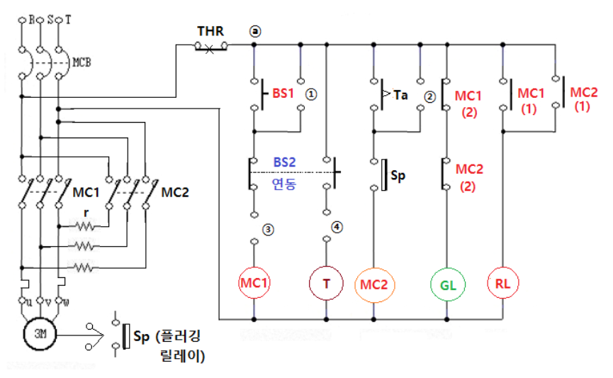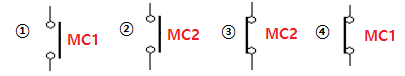 ㄷ. 이때 BS2의 연동접점으로 T가 MC1 소자 즉시 여자되며, BS2를 누르고 있는 상태에서 설정시간 후 MC2가 여자되어 전동기는 역회전하려고 한다. (자기 유지)