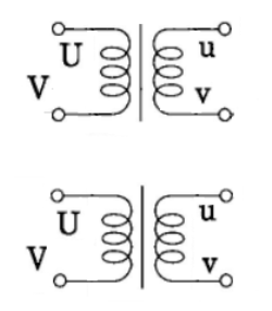 1차측 권선은 분로권선으로, 1차측과 2차측이 병렬로 연결되고 1차와 2차가 공통으로 사용하는 권선이다. 따라서 단권변압기는 2차측의 한 단자를 1차측 분로권선에 연결하여 1차측 권선 + 2차측 권선의 합으로 전압을 승압하게 된다. 그러므로 문제의 그림에서 위쪽 변압기는 1차측 1단자 즉, 1차측 U단자를 2차측 v단자에 연결하고, 그림의 아래쪽 변압기는 1차측 V단자를 2차측 u단자에 연결한다. 그리고 1차측 변압기의 연결단자에서 2차측 중성선 단자를 인출하게 되면 3상 V결선 승압기를 결선할 수 있다.