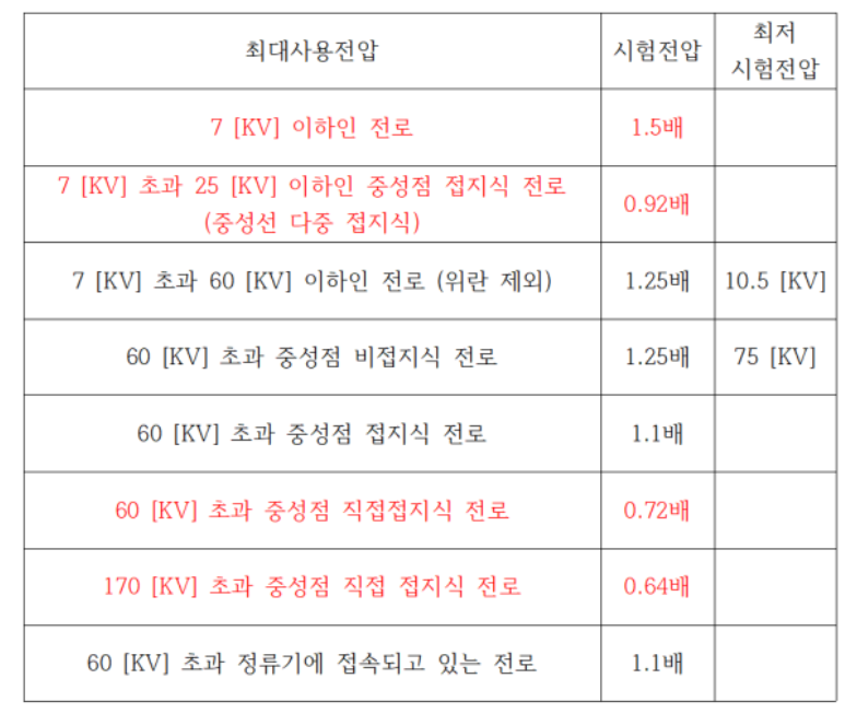 1) 전로의 절연내력 (출처: 전로의 절연저항 측정 및 절연내력시험 (02) : 네이버 블로그)