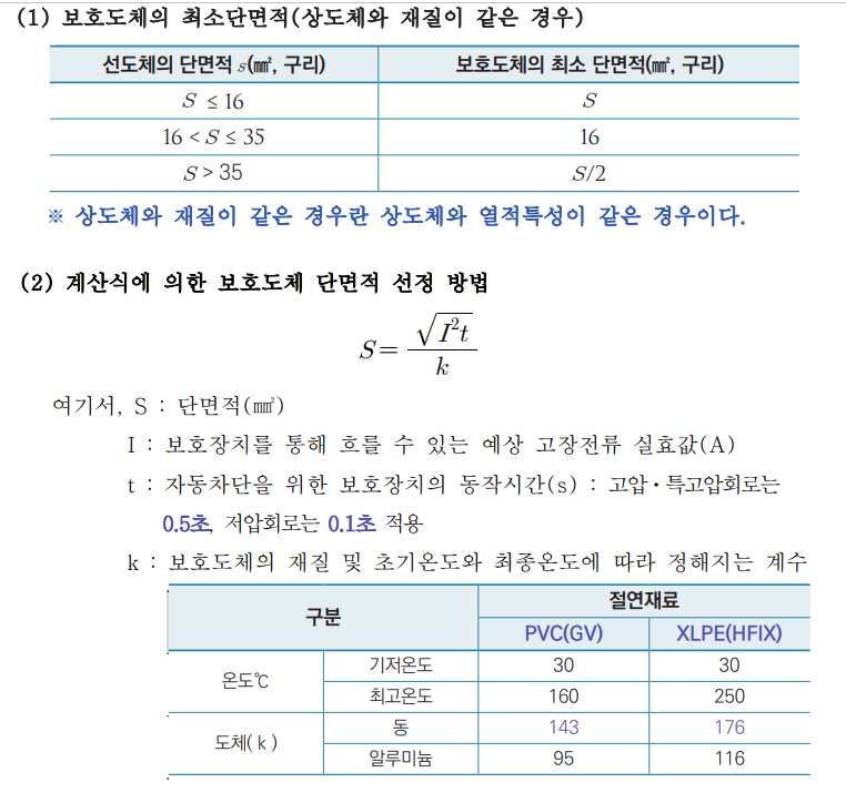 *보호도체 최소 단면적 및 계산식에 의한 보호도체 단면적 선정 방법